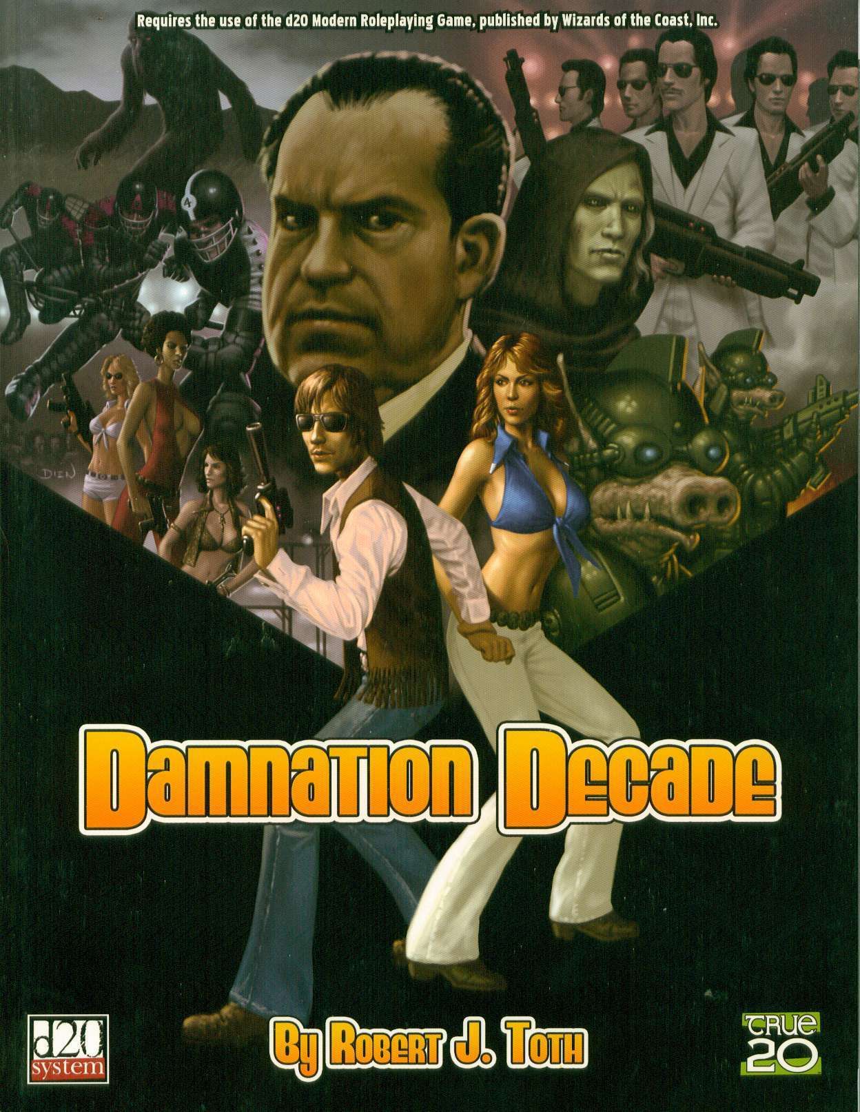 Enter the world of Damnation Decade, a Mythic Vistas setting for the d20 Modern roleplaying game and True20 Adventure Roleplaying. Inspired by the darkly satiric sci-fi cinema of the 1970s, the game throws the heroes into an off-kilter version of 1976--where the worst-case predictions of a paranoid era came true. The world's environment is collapsing, the oil is running out, and mysterious powers are asserting themselves: The skies are black with UFOs, huge-footed horrors haunt the forests, and prehistoric beasts lurk at the bottom of every lake. And that's the good news. The world will end on December 31, 1979--unless a fearless and funky band of heroes can battle the secret masters of the planet into submission! Damnation Decade is a complete campaign setting that includes: