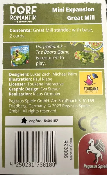 The Great Mill is a mini expansion for Dorfromantik: The Board Game and contains two cards and a mill standee. Unlocking the Mill achievement lets you score additional points for Grain Tasks and Yellow Flags by cleverly placing the mill piece.