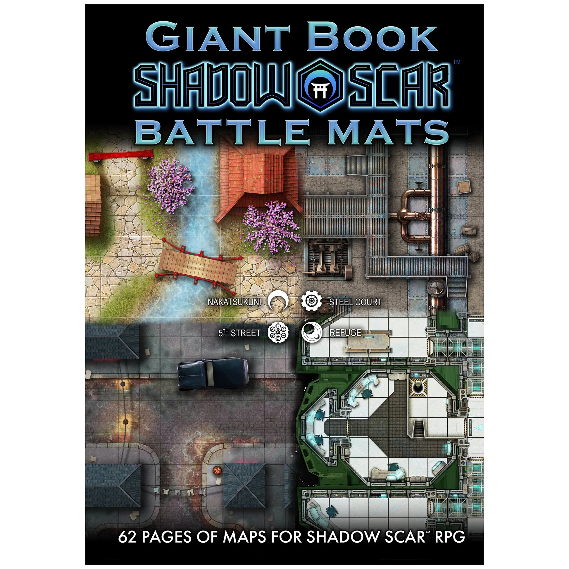 - 62 battle map pages tailored for the Shadow Scar RPG setting featuring Refuge, 5th Street, Steel Court and Nakatsukuni.