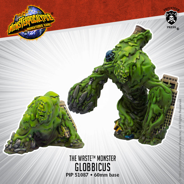 Human scientists are baffled by the emergence of the Waste. The only thing about these new destructive creatures that’s been verified by multiple sources is that they seem to be spreading from the Chicago area. The prevailing theories all propose Globbicus represents the impact the Monsterpocalypse is having on the planet Earth. Embedded in the creature’s free-flowing form are the remnants of a power plant. During the initial skirmish between Gorghadra and human forces, that great cosmic beast was thrown into a power plant, leveling it and suffering significant damage. Perhaps this repulsive entity was formed when some of the Planet Eater’s flesh came into contact with the fuel rods exposed in the facility’s destruction. Or perhaps the eldritch energies unleashed by the Lords of Cthul have shifted reality enough that the laws of physics are beginning to break down. Even less clear are the creature’s motives, and theories abound on the topic of its intelligence. The only thing scientists have come to a conclusion regarding is that more observation and samples are necessary to truly understand this new threat.