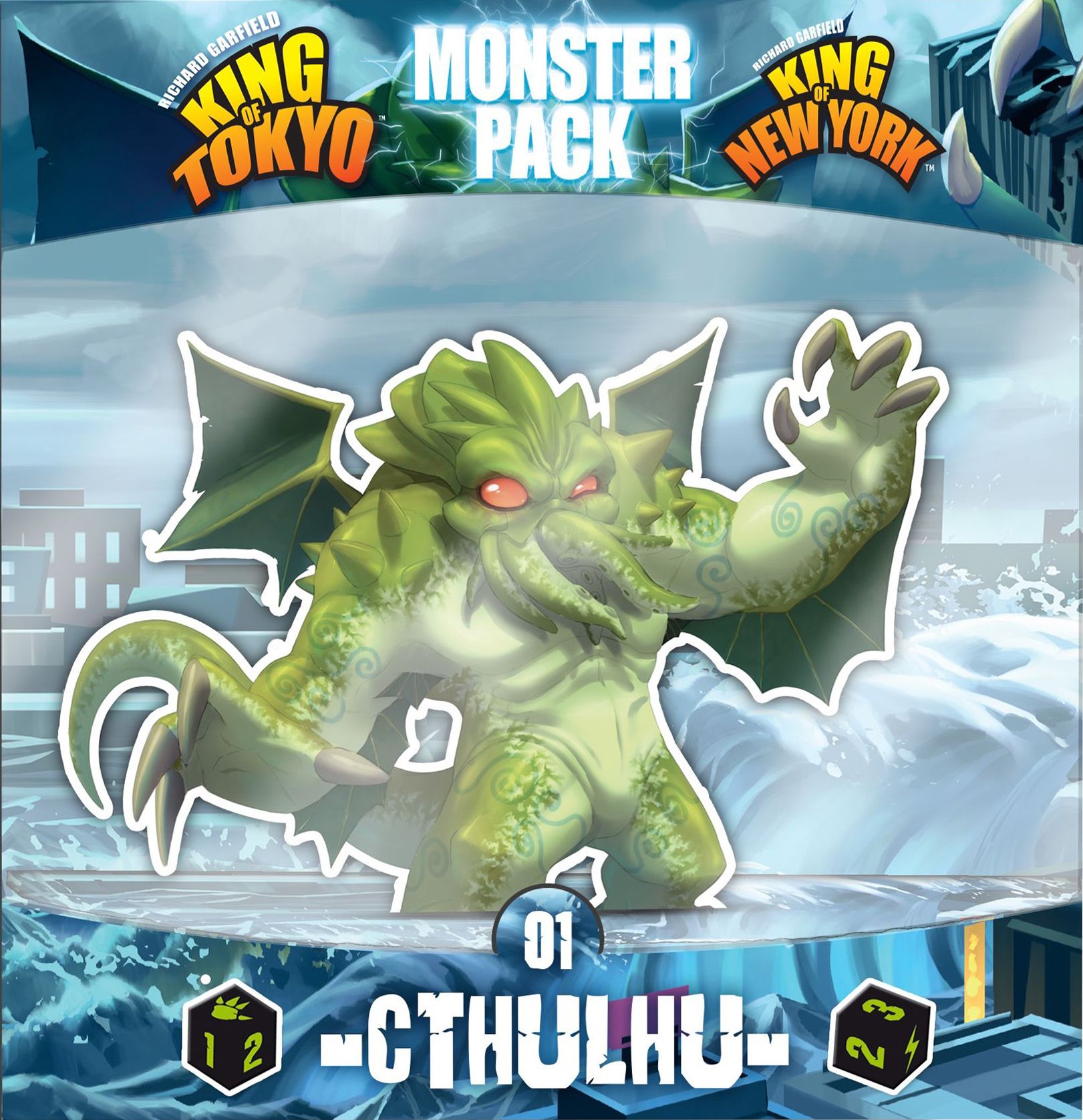 Monster Pack – Cthulhu includes a new monster — Cthulhu, in case you couldn't guess — as well as eight evolution cards to use with King of Tokyo. You can also play with the cultist tiles, giving players a bonus effect once they obtain it!