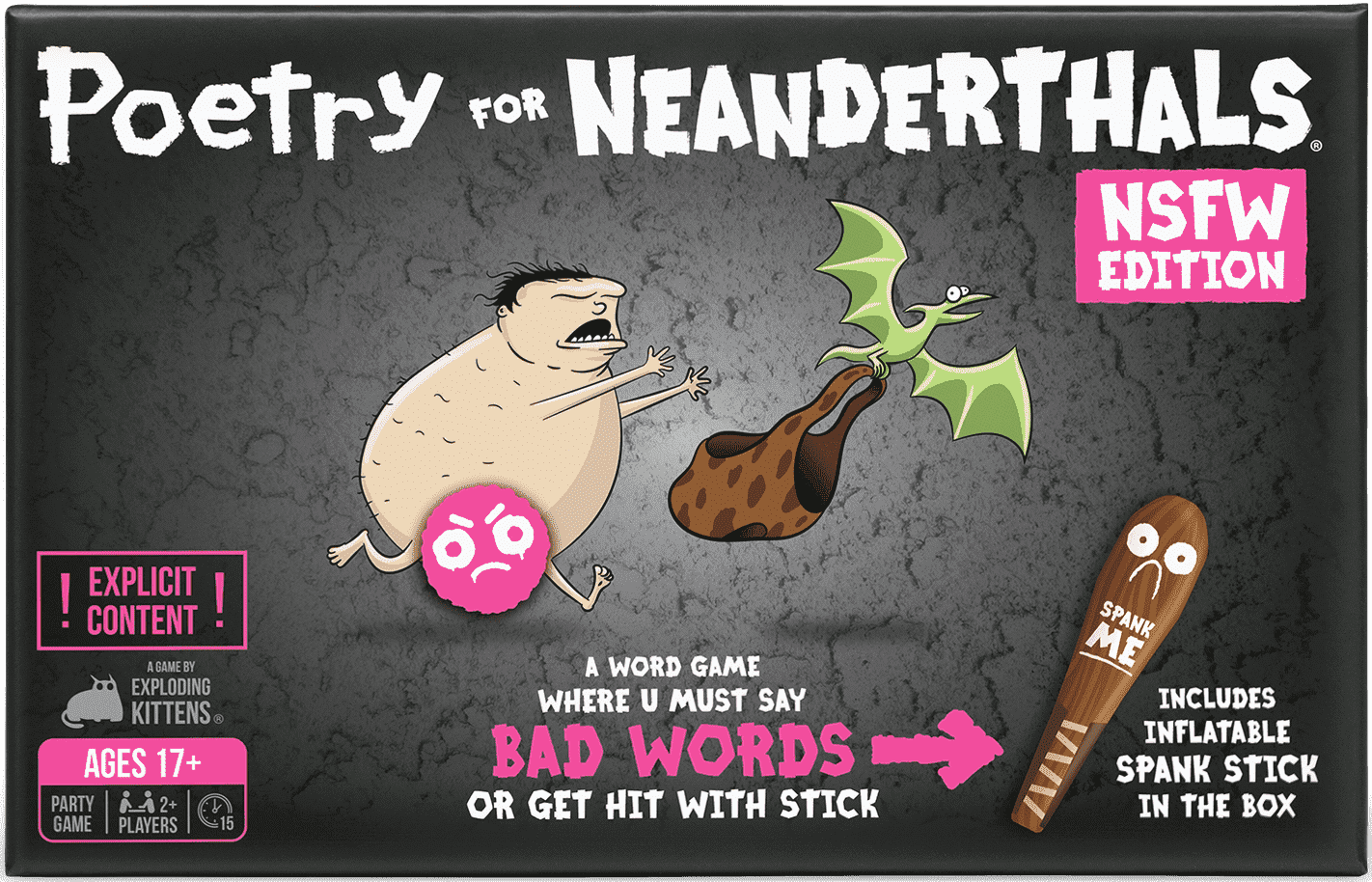Poetry for Neanderthals: NSFW Edition is an adult party game similar to Taboo in which players earn points by getting their teammates to guess words and phrases. The catch is that they are allowed to use only single-syllable words. Enjoy getting grandma to guess phrases like "nudist beach", "mile high club", or "banana hammock", but be careful. If you use any words with more than one syllable, the other team gets to spank you with the two-foot inflatable Spank Stick.