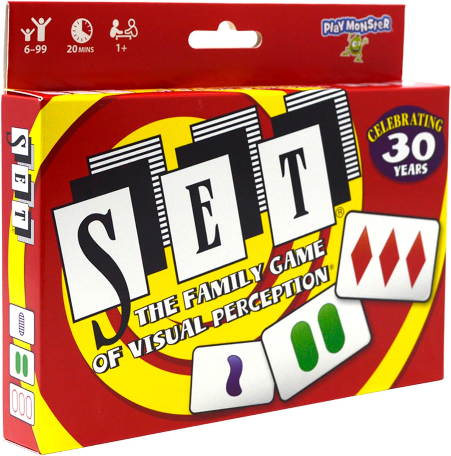To play, one person takes the deck and lays out twelve cards face up. The first person to spot a set collects those three cards; if the player was mistaken, then this player cannot claim a set until after another player has done so. After someone has claimed a set, the cardholder lays out three more cards. (If all players agree that no sets can be claimed, then the cardholder lays out three more cards. These cards aren't replaced after someone claims a set.) Whoever claims the most sets wins!