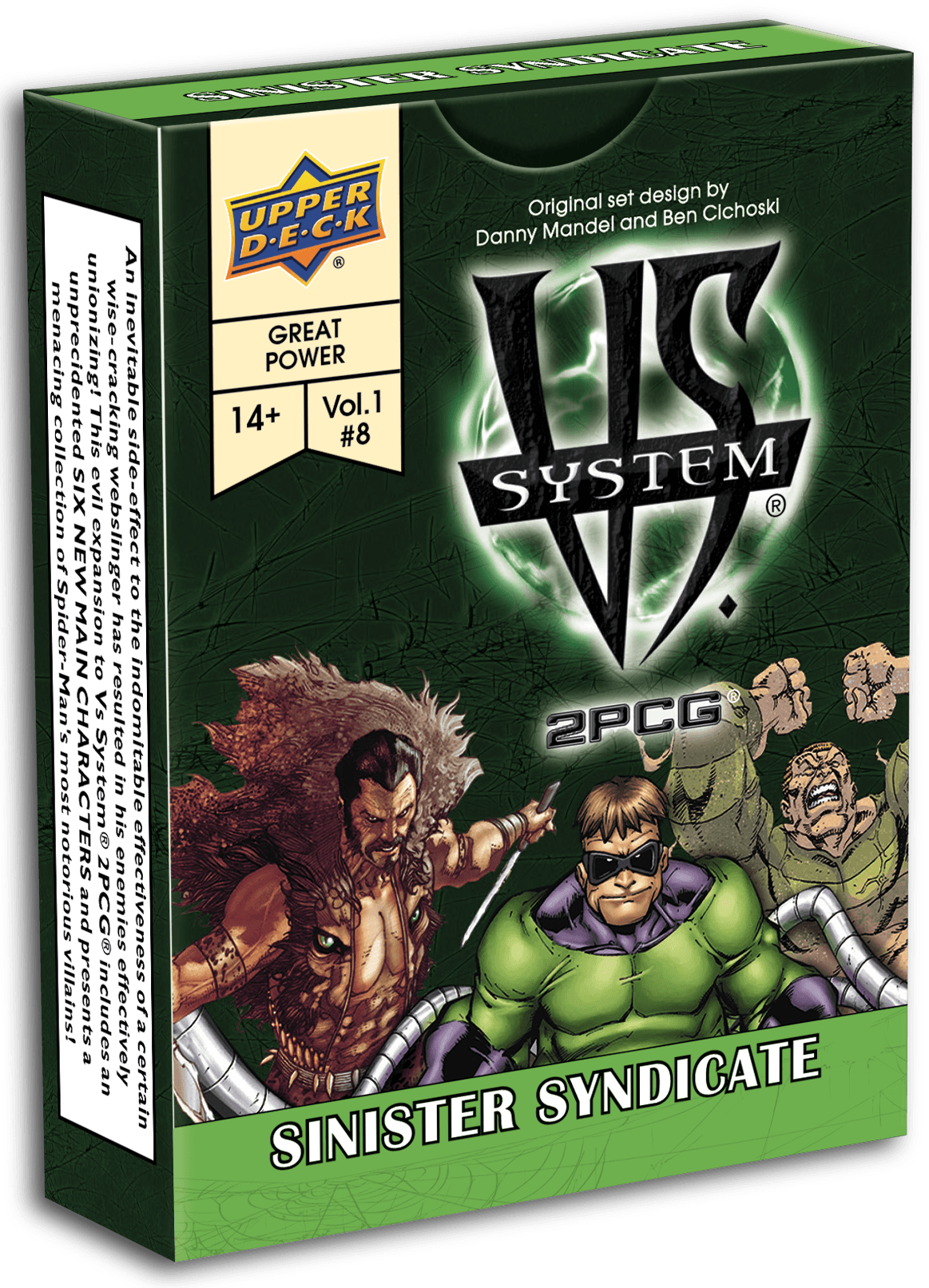 VS System 2PCG: Sinister Syndicate showcases 55 new cards that showcase Spider-Man's greatest foes. Including Main Characters, Supporting Characters, Plot Twists, and a Special Location. VS System 2PCG: Sinister Syndicate can be combined with any other VS System 2PCG sets.